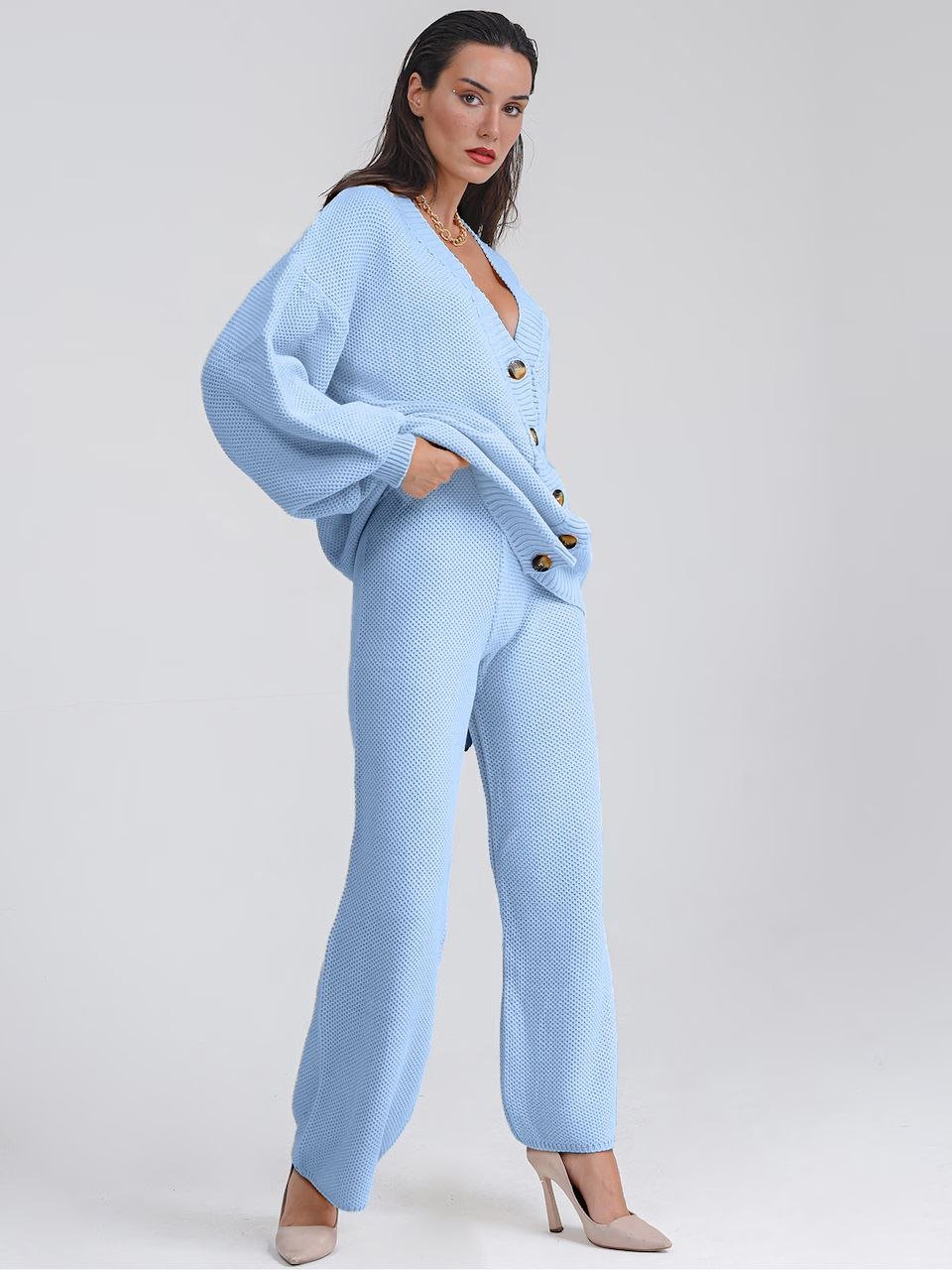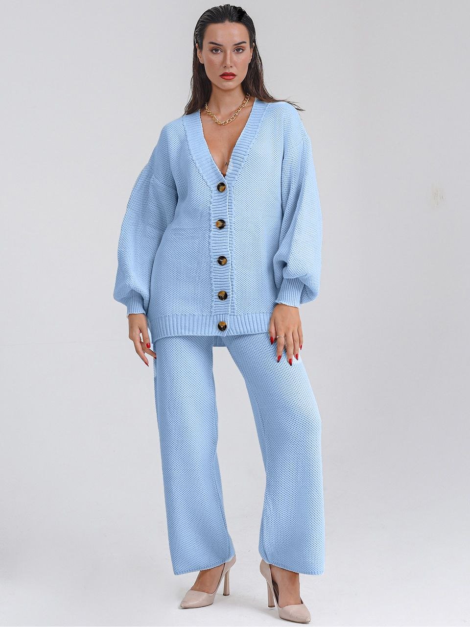 Baby blue Knitting Suit Hemp Flower Single-Breasted Knitted Cardigan+Pants